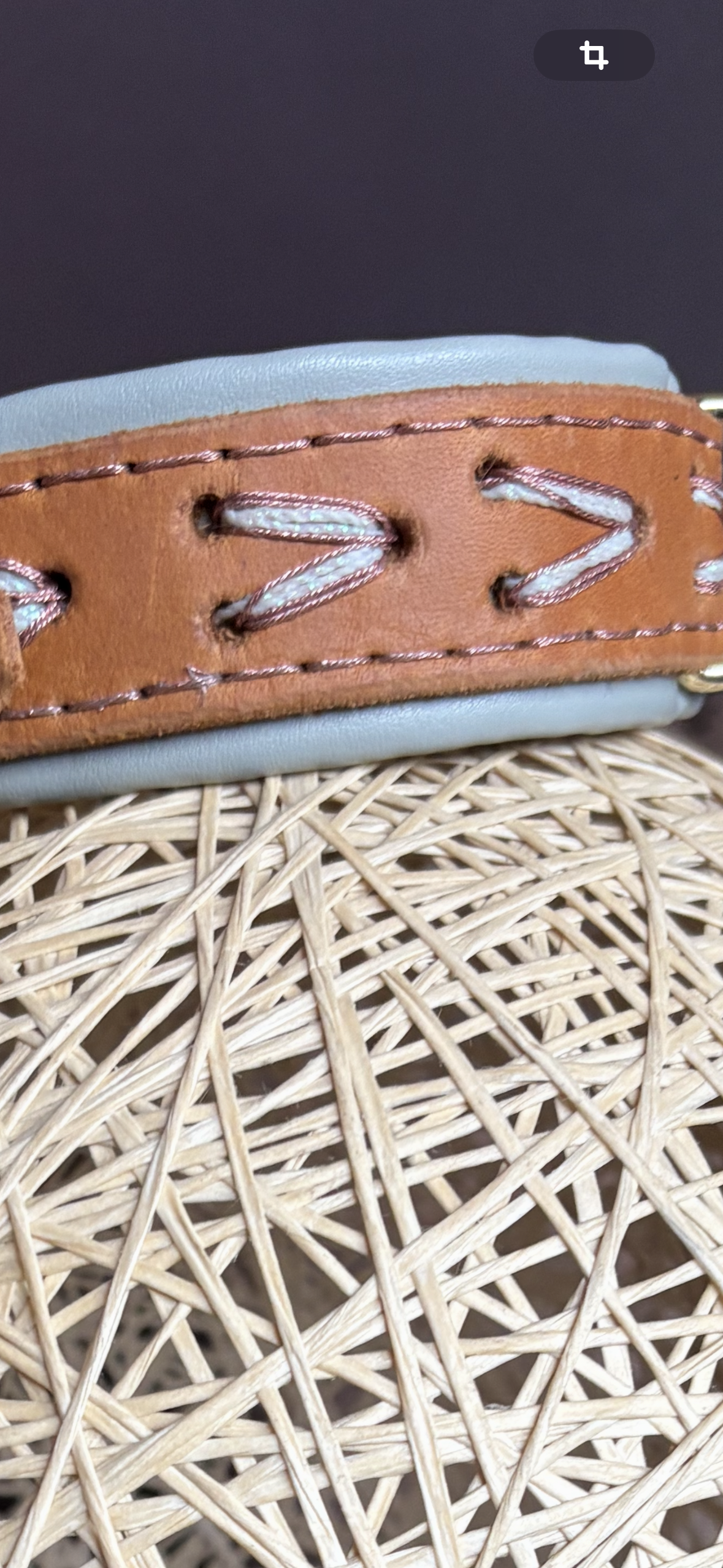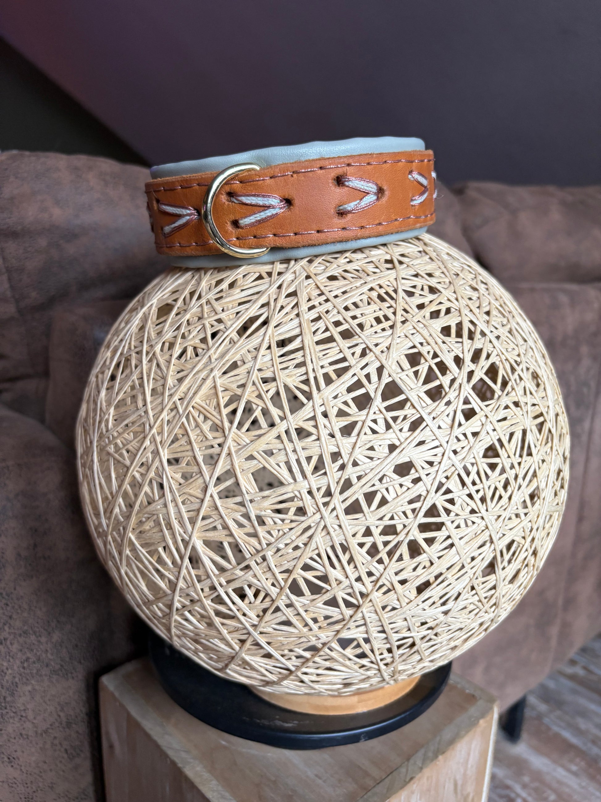 Dieses gepolsterte Lederhalsband in der Farbe Cognac ist circa 30 mm breit und wurde mit schlichten Schnürungen verziert. Es ist verstellbar und hat einen schönen Farbkontrast.